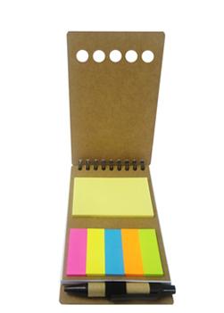 Bloco de anotações e caneta, material reciclado, com post-it.