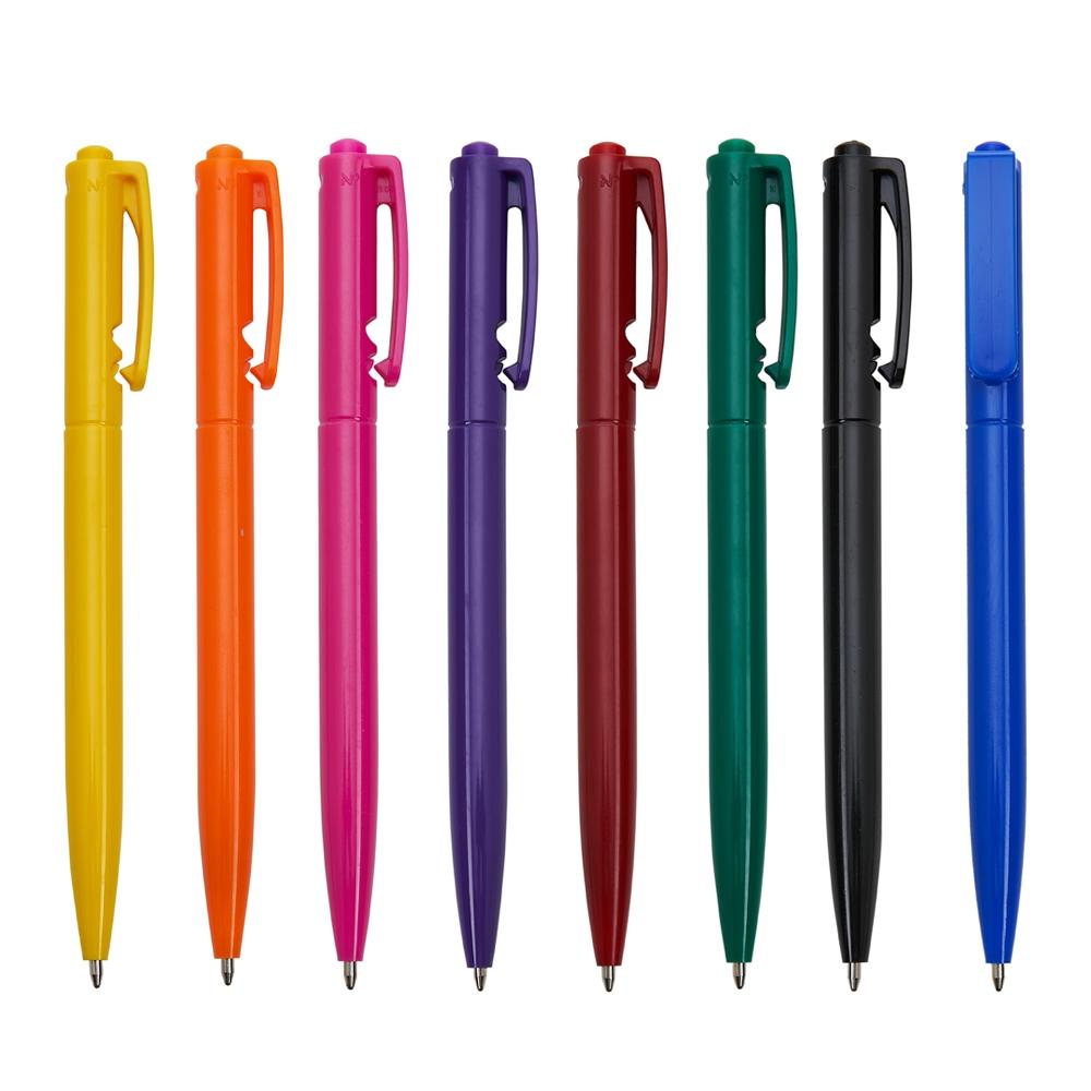 Caneta plástica inteira colorida. Possui um furo no lado oposto do clip e anel central em relevo. Aciona por clique.Medidas aproximadas para gravação (CxD):4 cm x 0,7 cm.Tamanho total aproximado (CxD):14,5 cm x 1,4 cm.Peso aproximado (g):9