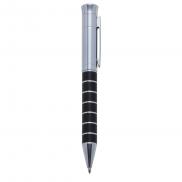 Caneta metal prata brilhante com detalhes preto. Possui seis anéis prateados, aciona por giro.Medidas aproximadas para gravação (CxD):3 cm x 1 cm.Tamanho total aproximado (CxD):13,4 cm x 1,5 cm.Peso aproximado (g):27