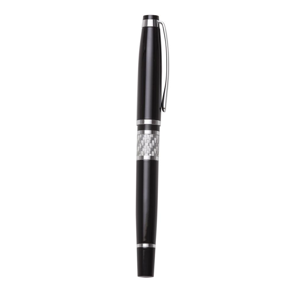 Caneta metal roller preto com detalhes em prata. Clip e anel superior prata, possui detalhe prata texturizado no centro e anel inferior prata. Basta puxar a tampa para utilização.Medidas aproximadas para gravação (CxD):4,8 cm x 0,8 cm.Tamanho total aproximado (CxD):14 cm x 1,4 cm.Peso aproximado (g):36