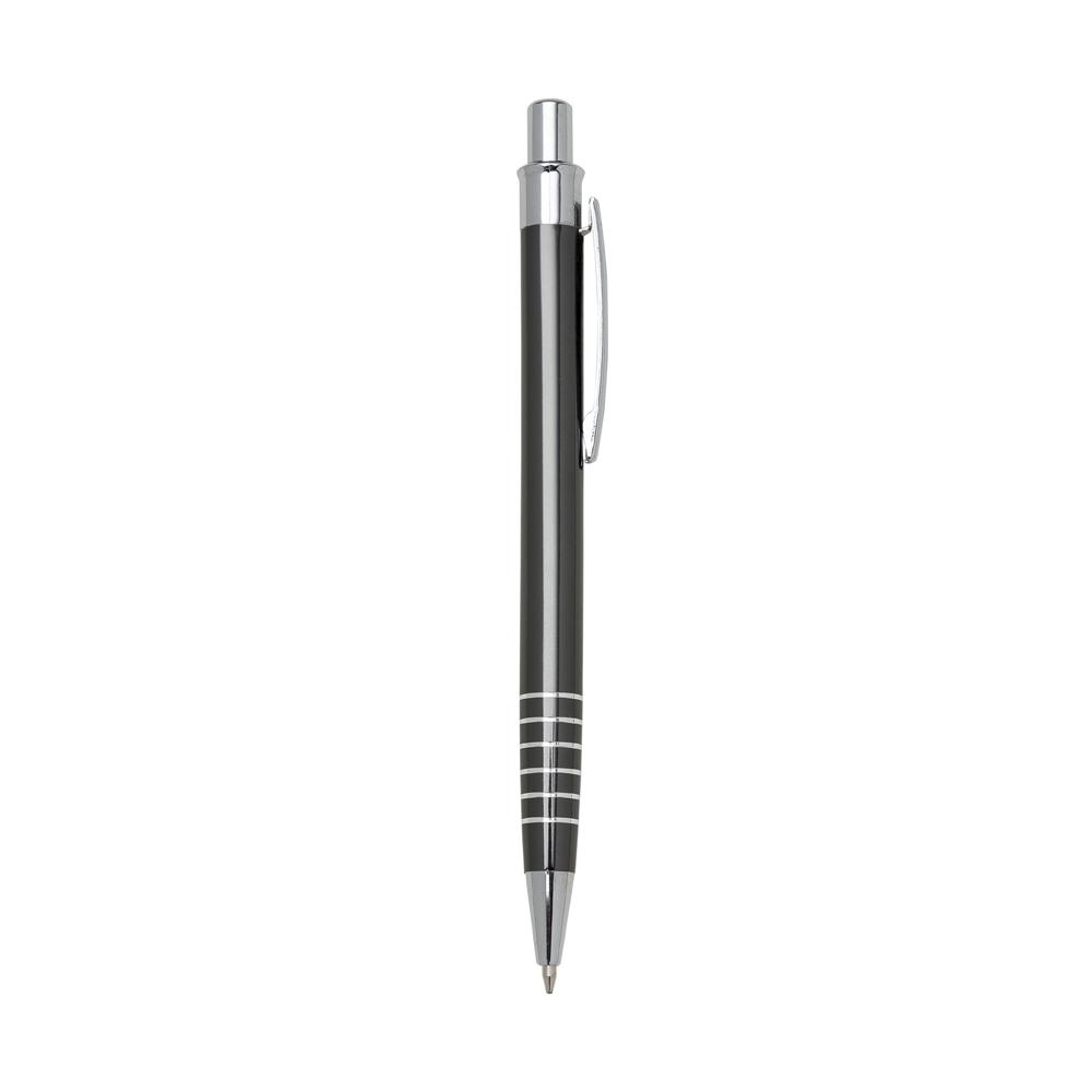 Caneta metal inteira colorida com detalhes prata. Clip metal e possui seis aneis prateados na parte inferior. Aciona por clique.Altura:139mm.Largura:13mm.Medidas aproximadas para gravação (CxD):3,5 cm x 0,7 cm.Tamanho total aproximado (CxD):13,9 cm x 1,3 cm.Peso aproximado (g):14
