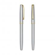Caneta metal roller prata com tampa. Possui clip e anel central dourados.Medidas aproximadas para gravação (CxD):5,2 cm x 0,8 cm.Tamanho total aproximado (CxD):13,4 cm x 1,3 cm.Peso aproximado (g):22